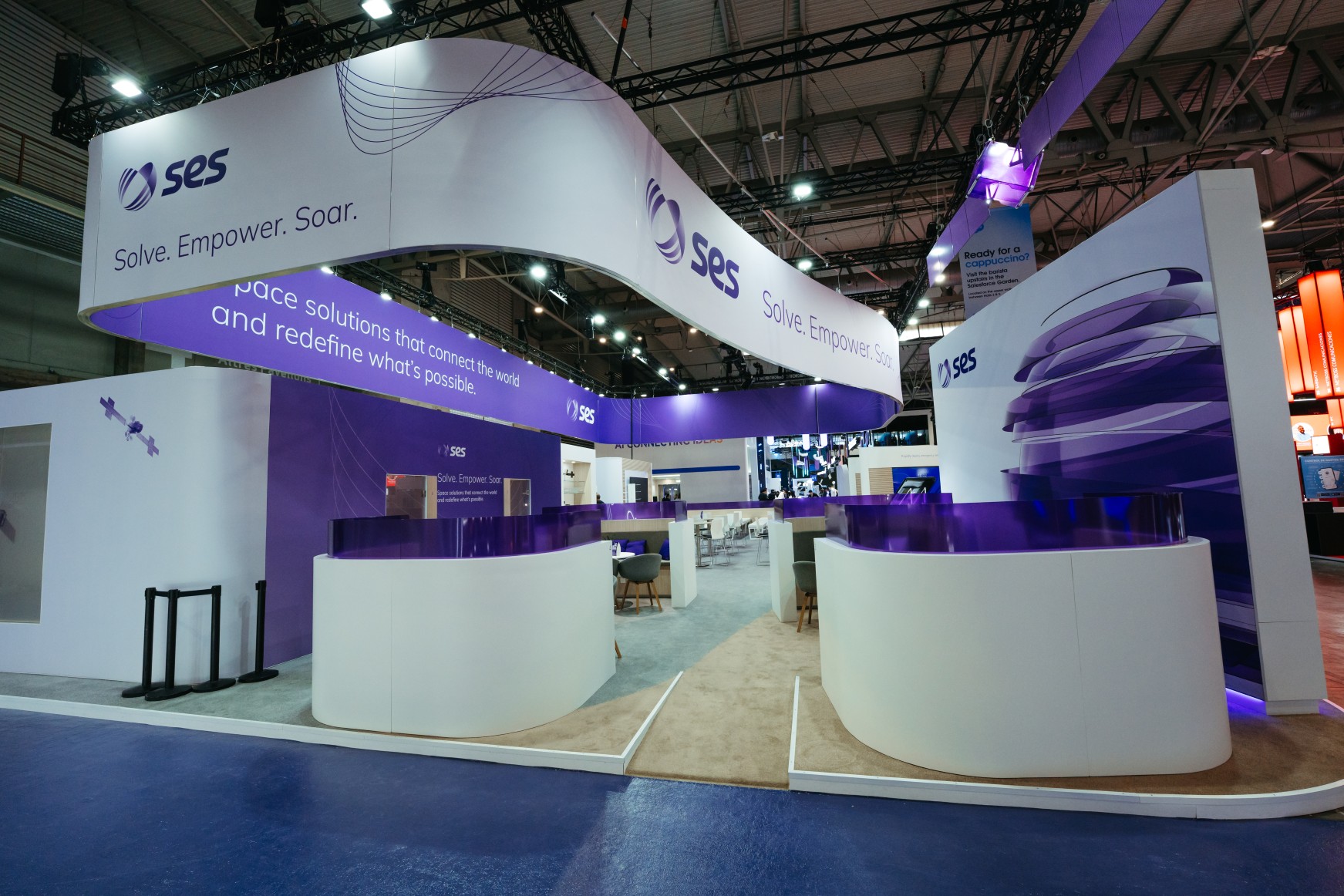 The stand design and build integrated SES's updated brand identity throughout: from spatial layout to material choices and graphic language. The aim was coherence: a stand that felt unmistakably SES, without simply restating what had come before.